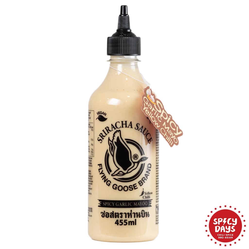 Flying goose sriracha mayo je ljuti umak u obliku majoneze, no ne one na koju ste navikli od njih! Ova je bijele boje, a ljutinu dobiva od zelenih chili papričica pa joj je okus drugačiji od klasične srirache mayo. Naravno, svi već znaju što je sriracha i njen ljuto-slatko-češnjakasti okus. Ovaj proizvod možete zamisliti kao kombinaciju majoneze i srirache. Ovo kremasto čudo je pogodno za vegane i vegetarijance. Ako želite eksperimentirati s drugim okusima, Flying goose ima zavidnih 18 kombinacija okusa srirache od kojih većinu (ili čak sve) imamo u ponudi!