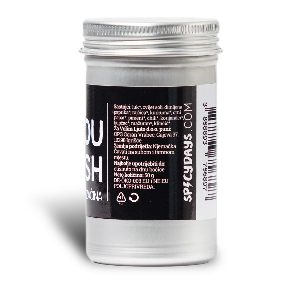 Luk*, cvijet soli, dimljena paprika*, rajčica*, kurkuma*, crni papar*, piment*, chili*, korijander*, ljupčac*, mažuran*, klinčić*. * = organski uzgoj
