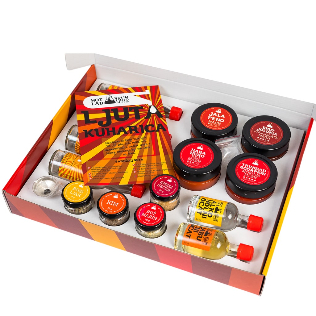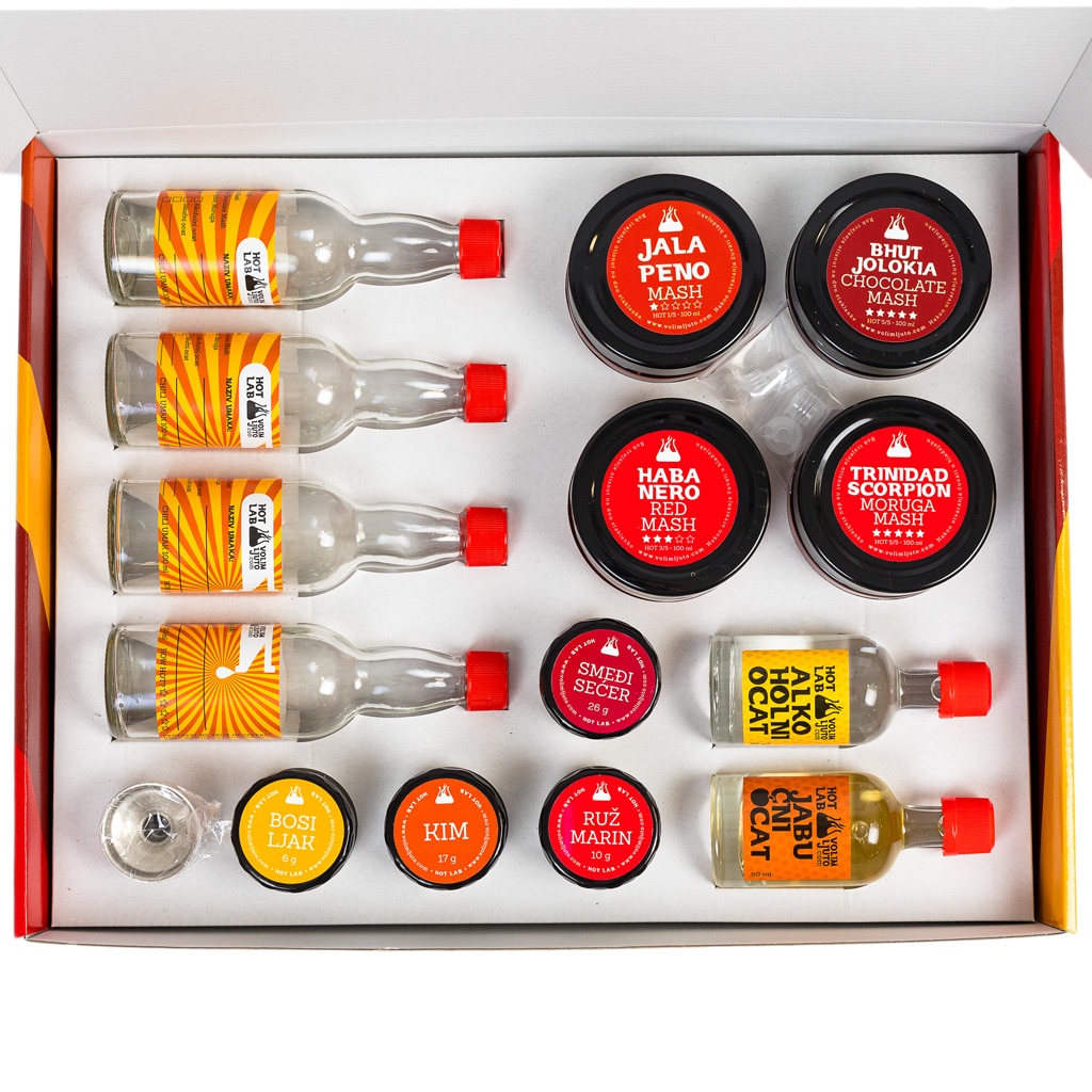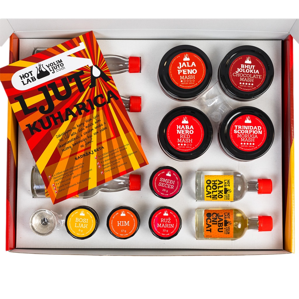 Hot Lab je set za izradu vlastitih ljutih umaka u kojem donosimo sve potrebno da biste sami mogli stvoriti svoj recept za savršeni ljuti umak! Set je pakiran u kartonsku kutiju s prigodnim otiskom i sadrži 4 masha različitih papričica: Jalapenol, Red Savina, Trinidad Scorpion Moruga, Bhut Jolokia Chocolate. Osim toga, set sadrži i 4 različita dodatka koje možete kombinirati sa svojim umacima : ružmarin, smeđi šećer, kim i bosiljak. Za kiselost i jači okus ovdje su alkoholni i jabučni ocat, a spakirali smo i 4 prazne bočice s dozatorima i naljepnicama na koje možete napisati što umak sadrži. Kako bismo olakšali pretakanje, u set smo dodali mali metalni lijevak i malu letak sa smjernicama za izradu umaka. Ovaj set oduševit će svakog zaljubljenika u ljute umake, a pogotovo one koji vole eksperimentirati i kuhati nešto novo. Osjećate se kreativno? Poklonite sebi ili dragoj osobi nešto za razvijanje ljutog gastronomskog užitka! P.S. Priloženi dodaci su naš prijedlog, ali uvijek možete razmišljati i izvan okvira 😉