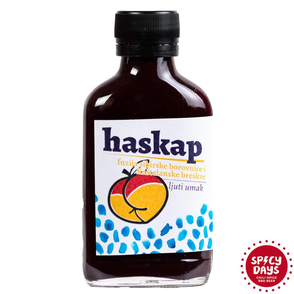 Juta Spiza Haskap voćni je ljuti umak iz kuhinje Jute Spize, a spaja borovnice s mandarinama! Evo što oni kažu o njemu: “Može li nešto bit 200% domaće? Ako u ljuti umak ubacimo 100% Kaštelanske mandarine i 100% domaću sibirsku borovnicu iz Male subotice, daje li to onda 200% domaći umak? Mislim ako igrači mogu na utakmici dat 120% posto od sebe.. (sebe ciloga i onda još malo), onda imamo i mi pravo za ovaj umak reć da je 200% domaći. OPG Igor Hrustek nam je poslao svoju sibirsku borovnicu, aka haskap, koju karakterizira kiselkasti okus, ogromna količina vitamina i antioksidansa. Zdravlje do maksimuma, a onda smo još ubacili malo Kaštelanske mandarine i par komada 7Pot Douglaha.. ipak smo mi ‘Juta Spiza, a ne Lagana Spiza. Super-limitirana količina, ne čekajte puno! Više o sibirskoj borovnici na ; http://opg-hrustek.hr”