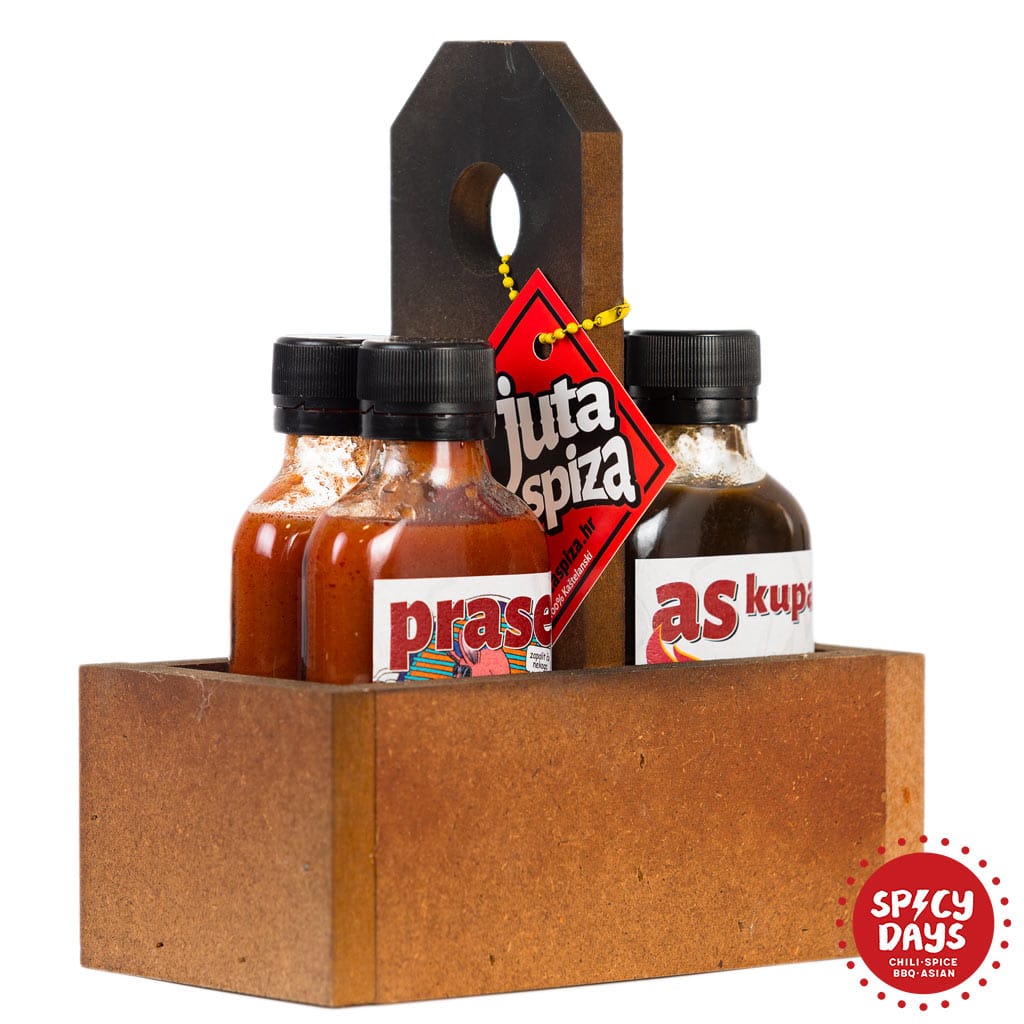 Juta Spiza Kašun drveni je stalak za 4 njihova 100ml ljuta umaka, a evo što oni kažu o njemu: “Dosadilo vam je nositi umake u rukama? Predstavljamo drveni stalak u kojeg stanu čak 4 ljuta umaka. Zapečatite rat s ukućanima tako da u hladnjaku držite drveni stalak koja zauzima puno više mjesta nego 4 umaka u vratima hladnjaka. Obilježite svoj teritorij, kupite tri stalka i držite jednoga na svakoj polici hladnjaka. Zaboravite dolazak na roštilj praznih ruku. Dok drugi plaćaju visoke svote za meso ili alkoholna pića, vi budite onaj koji donosi ljute umake i ušetajte s drvenom nosiljkom… Jesmo rekli da je od drva i da je ergonomski oblikovana tako da odgovara svim tipovima ruku? Nije bitno imate li male ruke, velike ruke.. bitno je samo da imate ruke, odnosno barem jednu jer u protivnome nosiljku morate nositi oko vrata kao lančić.. Ponosno napravljena u Kaštelima, od istih ljudi koji proizvode umake.”