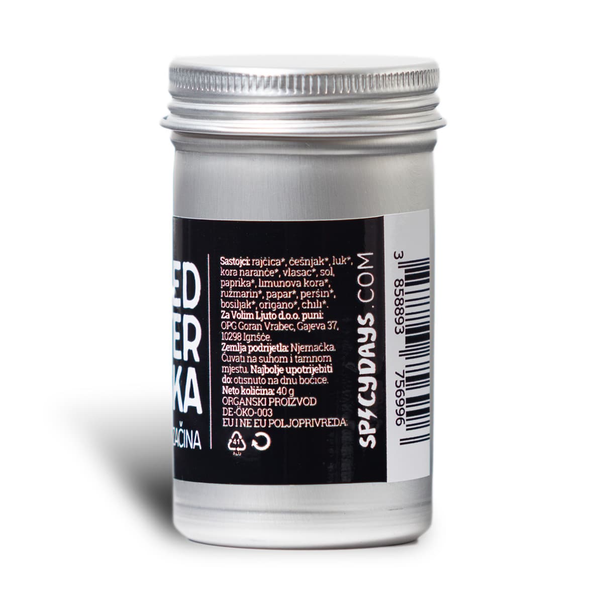 Rajčica*, češnjak*, luk*, kora naranče*, vlasac*, sol, paprika*, limunova kora*, ružmarin*, papar*, peršin*, bosiljak*, origano*, chili*. * = organski uzgoj