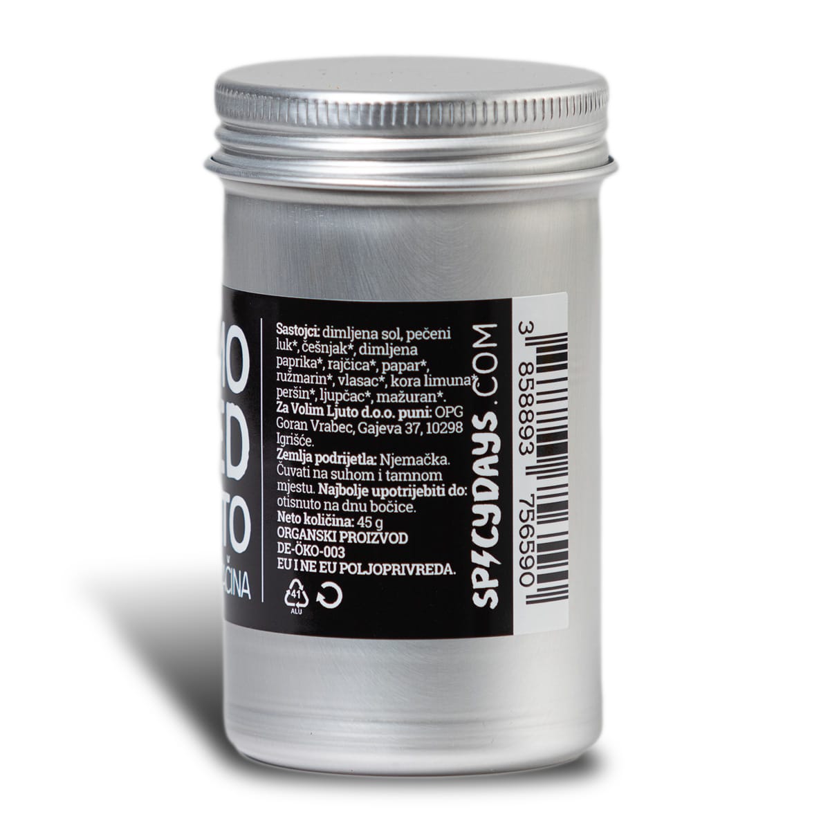 SASTOJCI: dimljena sol, tostirani luk, češnjak, dimljena paprika, organska rajčica, paprika, ružmarin, vlasac, kora limuna, peršin, ljupčac, mažuran
