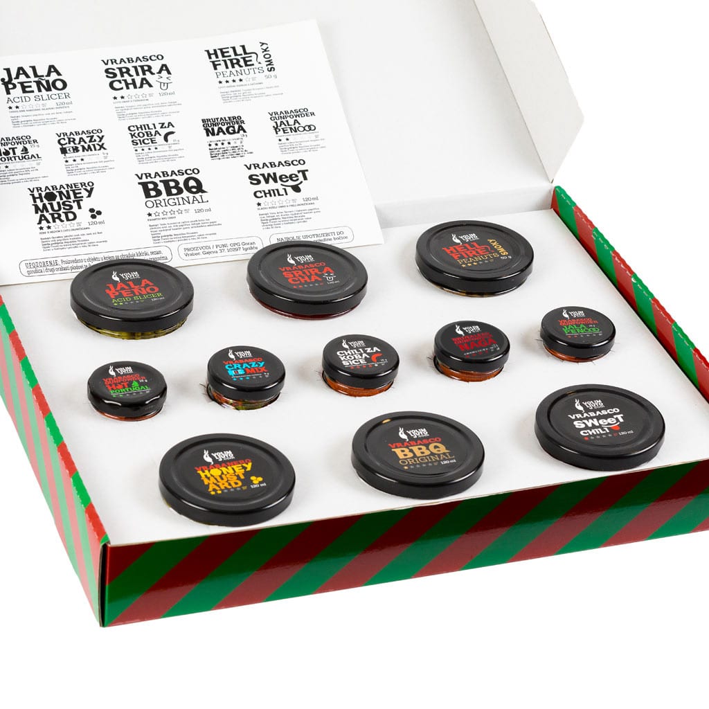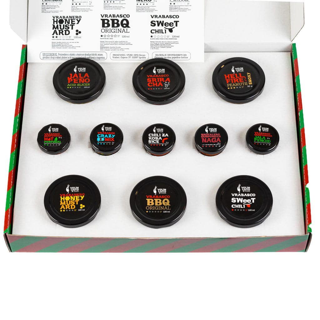 The Best Of Volim Ljuto poklon paket sadrži čak 11 različitih proizvoda iz naše ponude u malim, degustacijskim pakiranjima. Znamo da mnogo vas nema priliku probati naše proizvode jer niste u prilici posjetiti nas u Spicy Daysu ili na sajmu, a možda ne želite riskirati sa narudžbom pojedinačnog proizvoda. Tako smo došli do ideje da napravimo ovu poklon kutiju koja sadrži od svega pomalo! Većinu naših fermentiranih ljutih umaka mogli ste probati u poklon paketu Umijeće ljutine, no ovo je prvi tzv. degustacijski poklon paket u kojem ima i drugih najpopularnijih proizvoda iz naše standardne ponude.