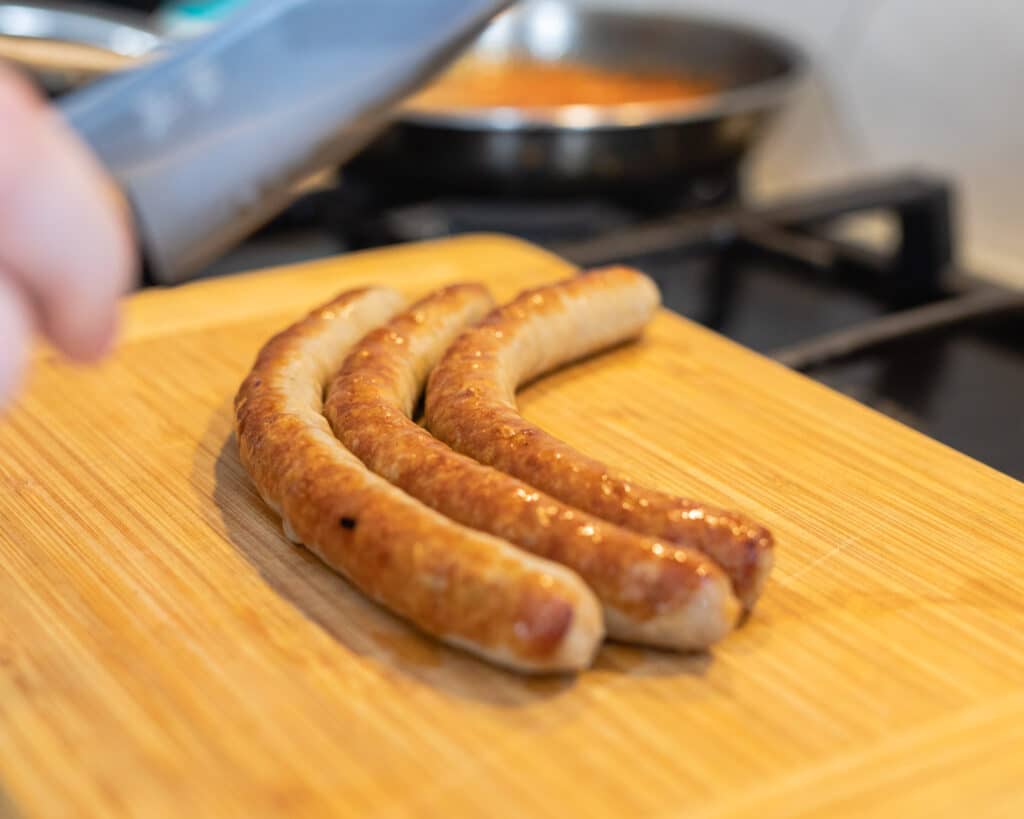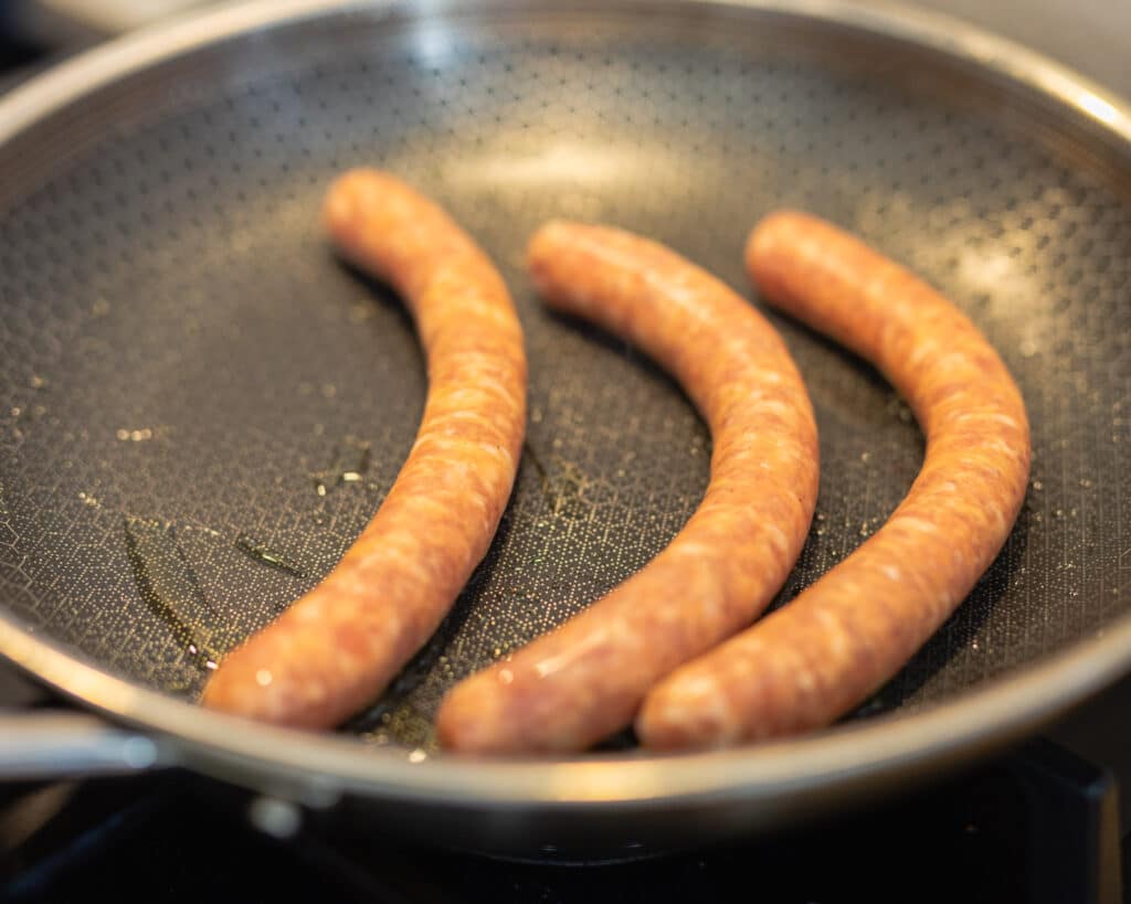 1. Kobasice ispecite na tavi prema uputama s pakiranja.