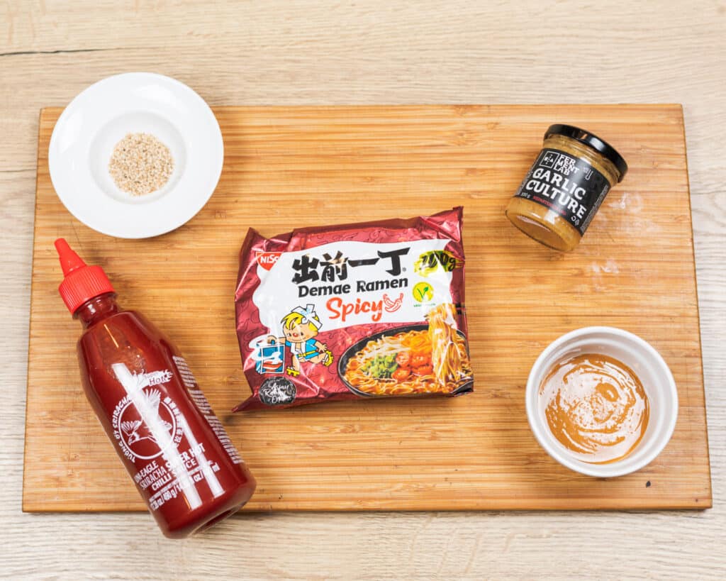 2. U zdjelici pomiješajte oko 3 žlice maslaca od kikirikija, srirachu, žličicu fermentiranog ili sušenog češnjaka te začine i ulje iz instant ramen jela.