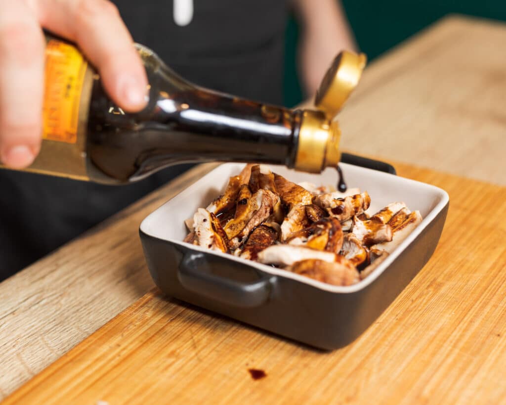 2. Shiitake krupno nascjeckate, te ih polijte octom i soja umakom (količinu odredite tako da prekrije sve gljive). Ostavite ih da se “ukisele” barem sat vremena.