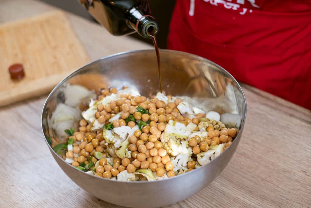 - Povrće i slanutak u velikoj zdjeli prelijte maslinovim uljem. Dodajte pripremljenu začinsku mješavinu, sol i svježe mljeveni crni papar.