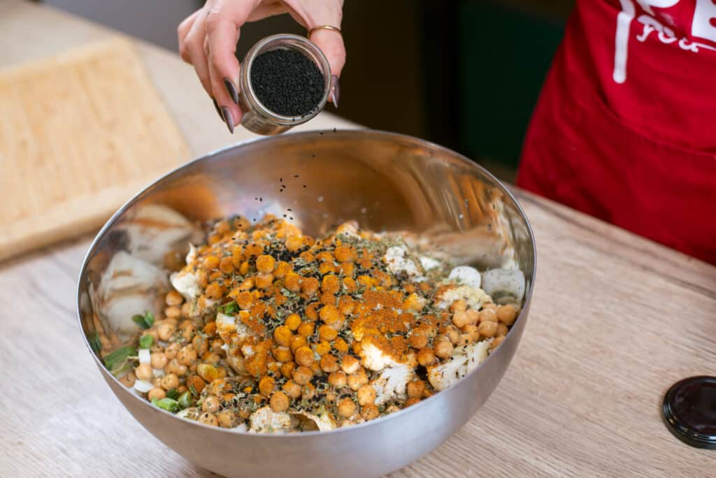 - Sve temeljito izmiješajte rukama ili velikom žlicom tako da se povrće i slanutak ravnomjerno oblože začinima.