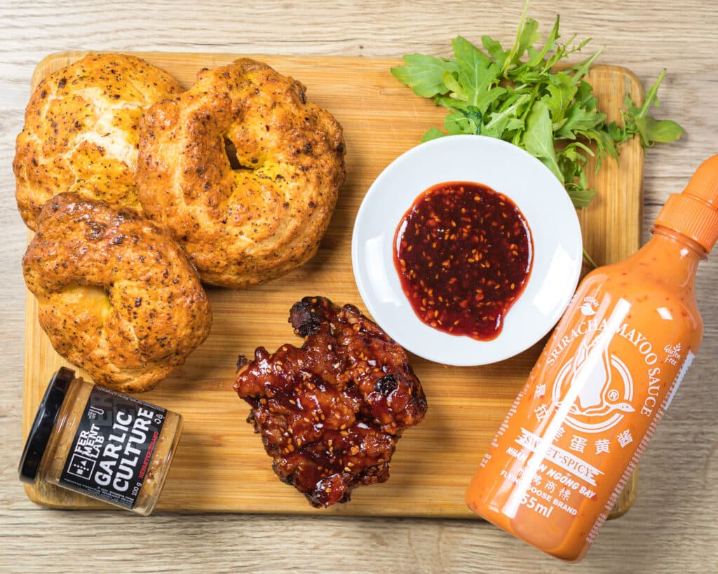 Budući da smo pripremili vlastite bagelse, fermentirani ljuti med i piletinu, ovaj recept zahtijeva malo planiranja – ali nama se trud itekako isplatio na kraju.