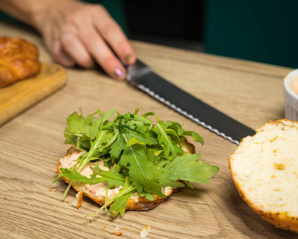 - Bagelse prerežite na pola. Ako želite, lagano ih tostirajte u pećnici ili tosteru.