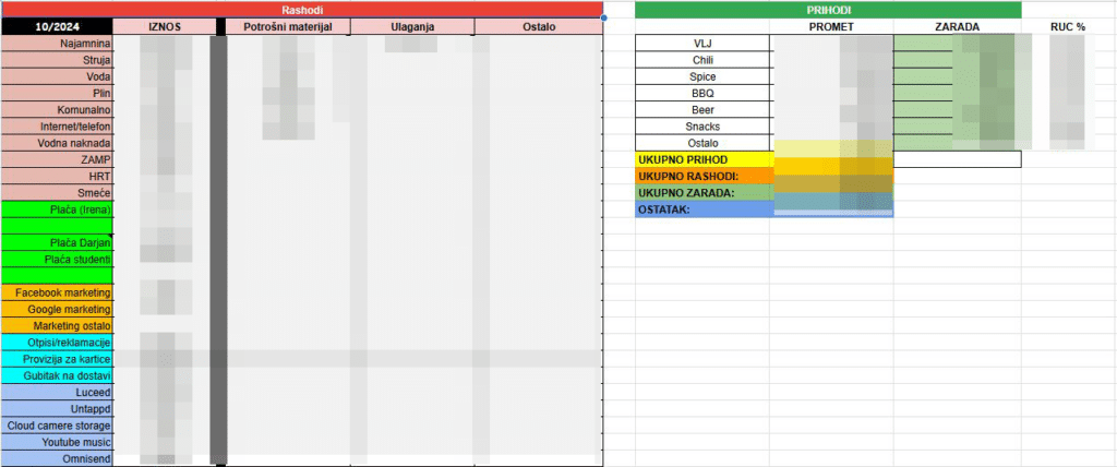 Vodimo naprednu statistiku za svaki mjesec, te sve prihode i rashode stavljamo u tablicu koju možete (djelomično) vidjeti u nastavku. Iz te tablice, podaci se gledaju na drugom sheetu i iscrtavaju graf i ispisuju sve relevantne podatke o poslovanju trgovine. Takvu statistiku vodimo odavno, i znamo gdje je završio praktički svaki cent i koliko nas košta poslovanje, tako da naše odluke nisu ishitrene i donesene zbog premalo znanja i iskustva, već uz naporne i teške razgovore, neprospavane noći i sentimentalno odgađanje neizbježnog zbog dobrobiti zajednice i ljubavi prema pivu.